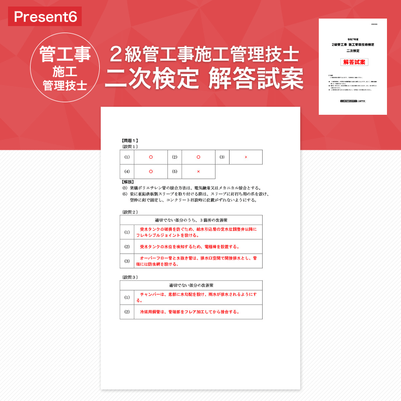 2級管工事施工管理技士 二次検定 解答試案2025年度(令和7年度)2級管工事施工管理技士 二次検定の解答試案です。試験の見直しや、今後の試験対策にご活用ください。