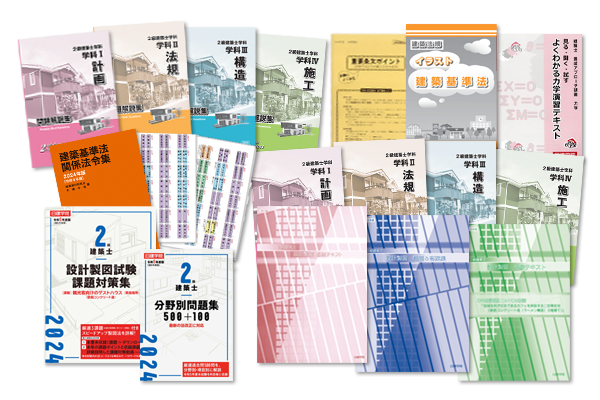日建学院オリジナルの教材セットは、学科通学講座と同様の教材です。受験テキストや問題集、法令集はもちろん、設計製図対策の副教材も充実しています。