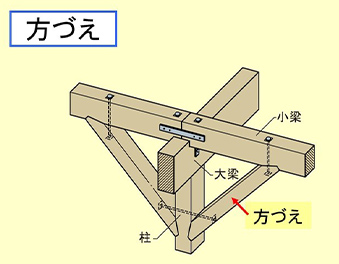 「方づえ」は柱と横架材の交点の入隅部分において柱と横架材を斜めに結んで、隅を固める部材だぞ。