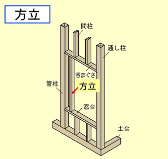 「方立」は開口部の位置や幅に合わせて取り付けた細長いたて材だぞ。